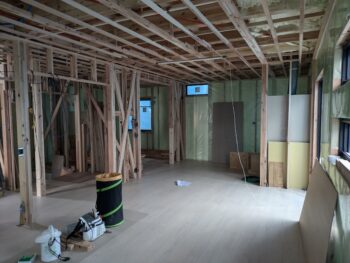床のフローリング貼りを行います。床貼り後、すぐに養生を行います。