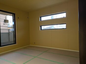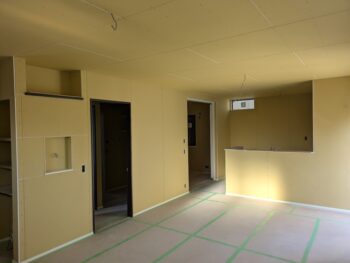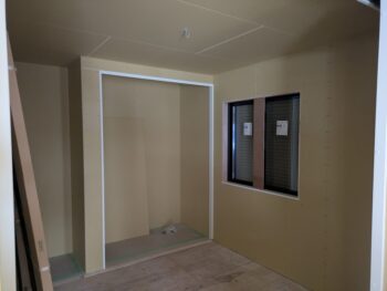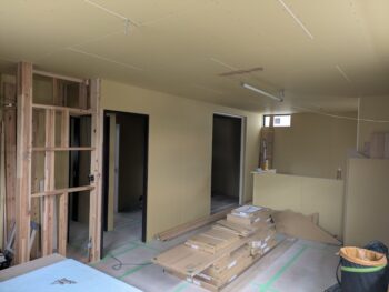 石膏ボード貼りが完了し、建具枠を取り付け、扉吊り込み巾木取付を行い、完了いたします。