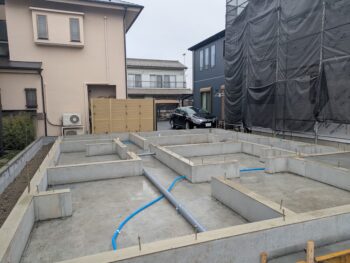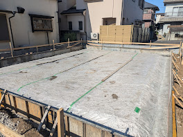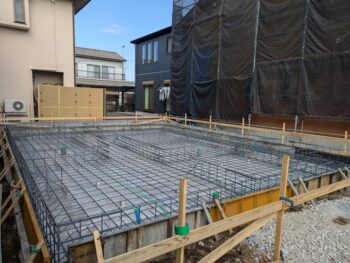基礎鉄筋コンクリート構造体の骨組みである鉄筋を組み立てる作業です。図面をもとに組み上げていきます。図面通りにできているか施工に不備はないかなどの第三者機関による配筋検査に適合しなければ次の工程に進めません。