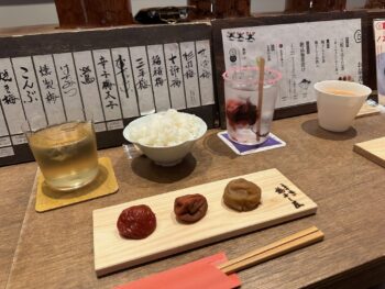 店内のカウンターで10種類以上の梅を食べ比べることができ、ご飯やお酒をいただくことができます。