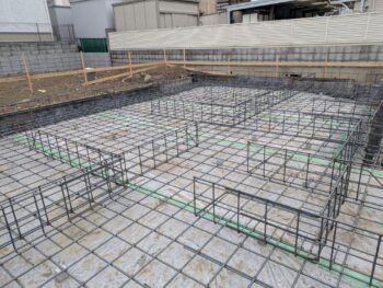 立りを打ち打つ際に、しっかり枠組みを行い、その中へコンクリートを流し込みます。振動機などを使い、枠の中に満遍なく行き渡るようにします。アンカーボルト関係は先に配筋に抱かせて固定しておきます。