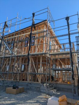 外壁の下地貼り。これも第三者機関の検査項目です。下地の貼り合わせかぶりはしっかりとれているか、屋根との取り合い部分のおさめはしっかりできているのかなど雨水の侵入の恐れのある個所をチェックしていきます。
