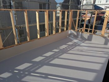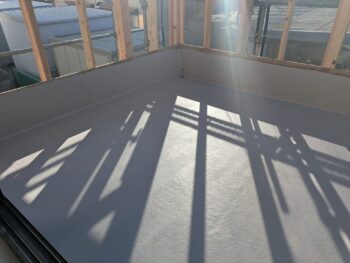 屋根の下地となる屋地板を貼り、一日の作業は完了となります。翌日に屋根材の下地葺きを行い、ガルバリウム鋼板を葺いて屋根工事完了となります。