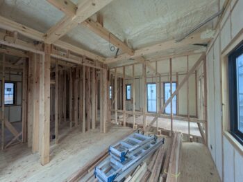 細かな泡状の断熱処理を施し、建物の気密性を向上させます。発泡ウレタン断熱完了後、気密シートで包み完了です。