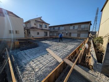 基礎鉄筋コンクリート構造体の骨組みである鉄筋を組み立てる作業です。図面をもとに組み上げていきます。図面通りにできているか、施工に不備はないかなど第三者機関による配筋検査に適合しなければ、次の工程には進めません。