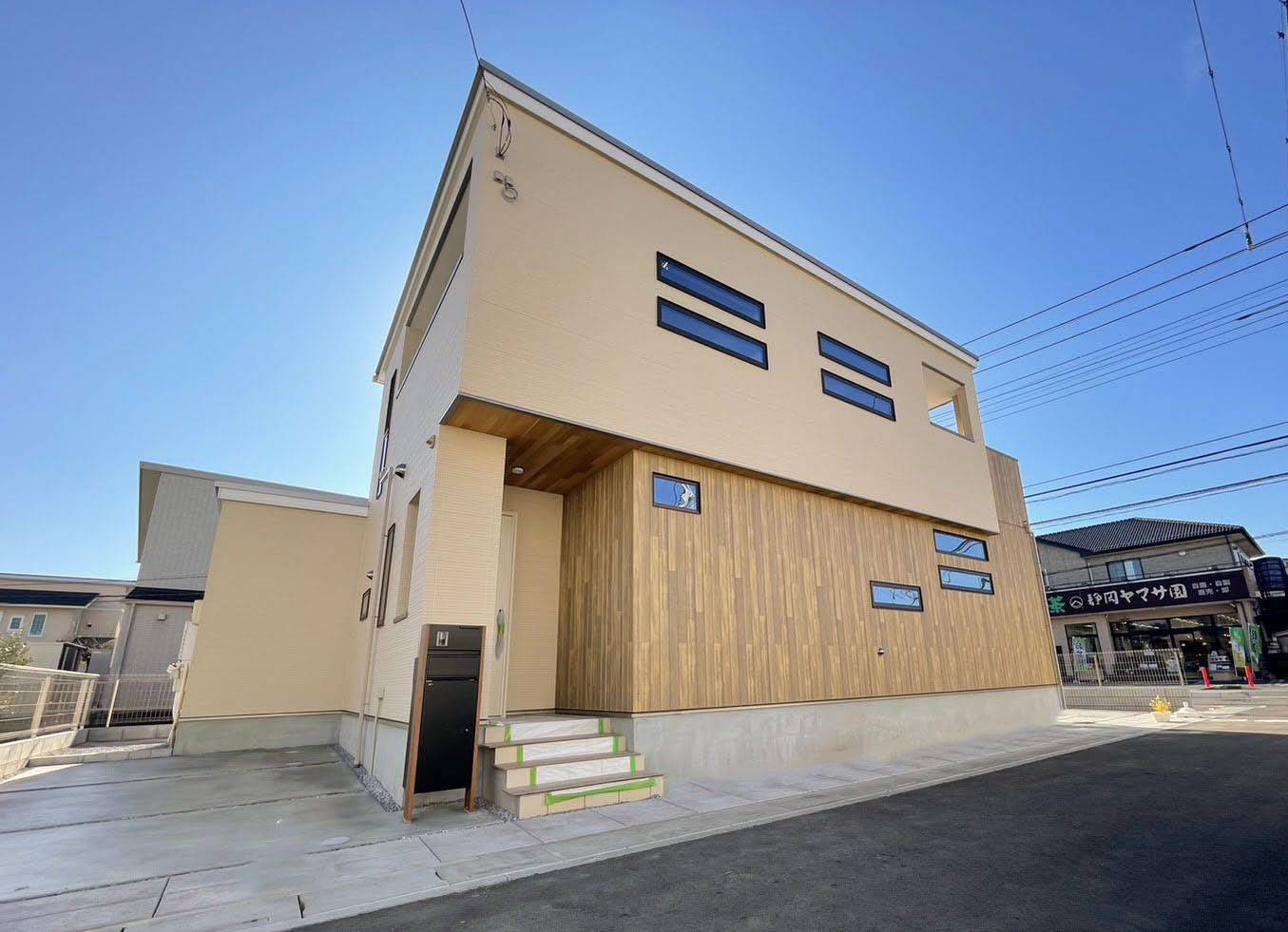 外観はクリームカラーと木目調の2トーンカラー、ブラウンのサッシを使用する